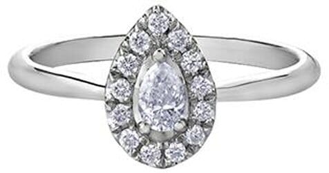 This elegant 10 Karat White Gold engagement ring features a captivating pear-shaped diamond at its centre, beautifully framed by a halo of sparkling diamonds. The delicate plain shoulders enhance the timeless design, making it perfect for those seeking a classic yet refined style. The pear-shaped halo setting adds a graceful touch to this stunning piece, ideal for a memorable proposal or special occasion. Customization is available for those who wish to explore different gold colours or karats.