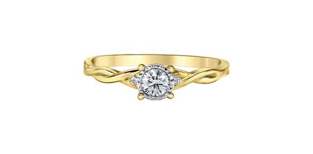 10 Karat Yellow Gold, White Gold Accent Diamond Engagement Ring. 0.18 Carat Center Diamond 0.20 Carat Total Diamond Weight.