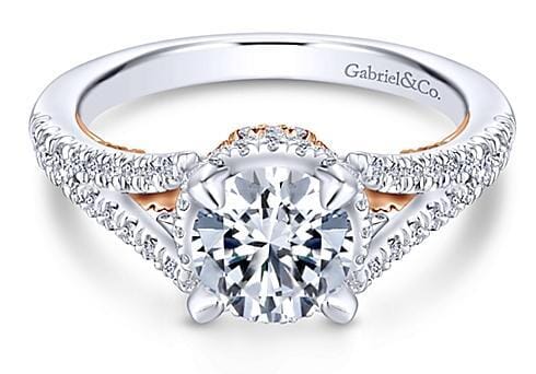 This stunning 14 Karat White Gold engagement ring with Rose Gold accents from Gabriel & Co. features our Signature brilliant cut lab-grown diamond at its centre. The round brilliant cut centre diamond is framed by an elegant halo design, complemented by diamond shoulders, adding an extra layer of brilliance and detail. The intricate interplay of white and rose gold creates a sophisticated two-tone look, evoking a sense of royal elegance. Ideal for those seeking a blend of classic grace and regal charm, this ring can be customized to match your unique preferences, from the diamond shape to the metal type.
