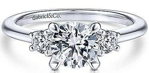 This classic 14 Karat White Gold engagement ring from Gabriel & Co. features our Signature brilliant cut lab-grown diamond at its centre, flanked by two stunning earth-mined accent diamonds. The three-stone design represents past, present, and future, creating a timeless and romantic look. The smooth, plain shoulders provide a refined contrast, highlighting the brilliance of each diamond. This ring is customizable to suit your preferences, and comes with our One Year Satisfaction Guarantee for your peace of mind.