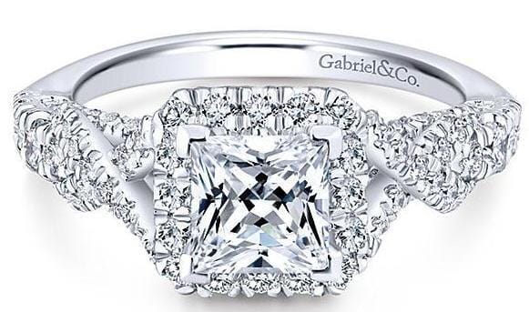 This stunning 14 Karat White Gold engagement ring from Gabriel & Co. showcases our Signature cut lab-grown diamond at the centre, framed by a dazzling halo of sparkling earth-mined accent diamonds. The elegant princess cut centre stone is beautifully enhanced by the halo and diamond-adorned shoulders, creating an eye-catching, timeless design. Perfect for celebrating your special moments, this piece combines a classic silhouette with a contemporary twist, making it a unique choice for any engagement.