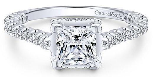 This sophisticated 14 Karat White Gold engagement ring from Gabriel & Co. showcases our Signature brilliant cut lab-grown diamond at its centre. The princess-cut halo design, highlighted by diamond-adorned shoulders, creates an elegant look. This ring beautifully blends the sparkle of lab-grown and earth-mined accent diamonds, offering a refined and thoughtful choice. Ideal for celebrating special moments, this ring is customizable to suit your preferences, allowing for adjustments in diamond shape, size, or metal type.