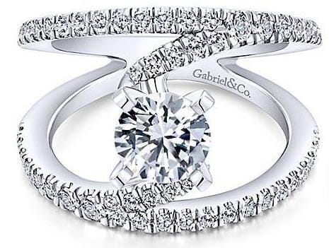 This 14 Karat White Gold Engagement Ring by Gabriel & Co. showcases a captivating design with a Signature Created Lab Grown Center Diamond, beautifully accented by Earth Mined Diamonds along its diamond-adorned shoulders. The unique criss-cross band adds an elegant twist to the traditional solitaire, making this ring an exceptional choice for those seeking modern sophistication. Plus, this engagement ring is fully customizable, offering you the flexibility to tailor every aspect, from the shape and size of the center diamond to the choice of metal. Whether you prefer lab-grown or traditional earth-mined diamonds, this ring can be crafted to suit your unique style. Ask about our "One Year Satisfaction Guarantee" to ensure complete confidence in your selection