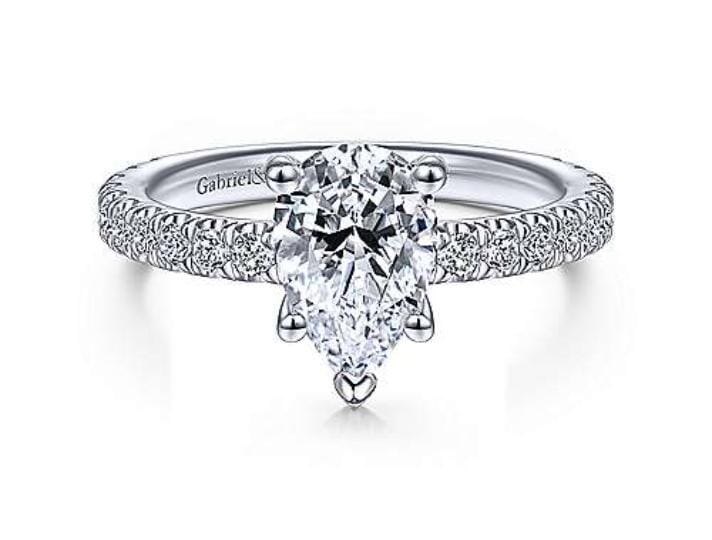 This stunning 14 Karat White Gold Engagement Ring from Gabriel & Co. features a Signature lab-grown pear-shaped center diamond, beautifully accented with earth-mined diamonds along the shoulders for a blend of contemporary elegance and timeless sparkle. The ring's brilliance is further enhanced by the total diamond weight, creating a striking visual impact. This design is fully customizable, allowing you to modify the shape and size of the center diamond, choose different karats or colors of gold, switch to platinum, or even combine design elements from different rings. If you prefer, traditional earth-mined Canadian diamonds are also available. Ask about our "One Year Satisfaction Guarantee."