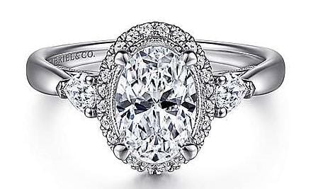 This exquisite 14 Karat White Gold engagement ring features a stunning oval-shaped Signature lab-grown diamond at its centre, surrounded by a shimmering halo of earth-mined accent diamonds. The elegance of the halo design is complemented by diamond-adorned shoulders, adding brilliance and sophistication to the piece. This engagement ring design is fully customizable, allowing you to tailor the shape and size of the centre diamond, adjust the gold's karat or colour, or even opt for platinum. Gabriel & Co.'s commitment to quality ensures that every detail is perfect. Whether you choose a lab-grown or traditional earth-mined Canadian diamond, this ring can be crafted to your exact preferences. Ask about our "One Year Satisfaction Guarantee" and explore the endless possibilities to create your dream engagement ring.
