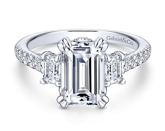 This 14 Karat White Gold engagement ring from Gabriel & Co. showcases our Signature brilliant cut lab-grown diamond, set within a stunning emerald-shaped design. Flanked by two side stones and enhanced by diamond shoulders, it offers a dazzling presentation that beautifully blends classic elegance with modern refinement. This piece is a perfect choice for those seeking an unforgettable engagement ring, with customization options to adjust the diamond shape, size, and metal type for a personalized touch.