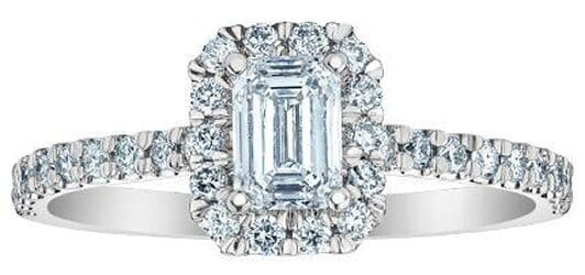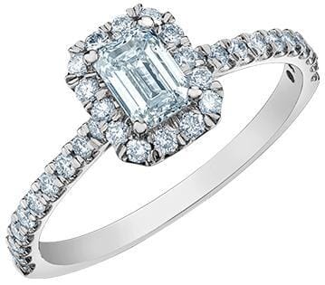 This elegant 14 Karat White Gold engagement ring showcases a captivating emerald-shaped centre stone surrounded by our Signature lab-grown diamonds. The halo design enhances the centre diamond's brilliance, while the diamond-adorned shoulders add a touch of sophistication. Ideal for a proposal or special occasion, this ring beautifully combines modern aesthetics with classic charm, making it a standout addition to any jewellery collection.