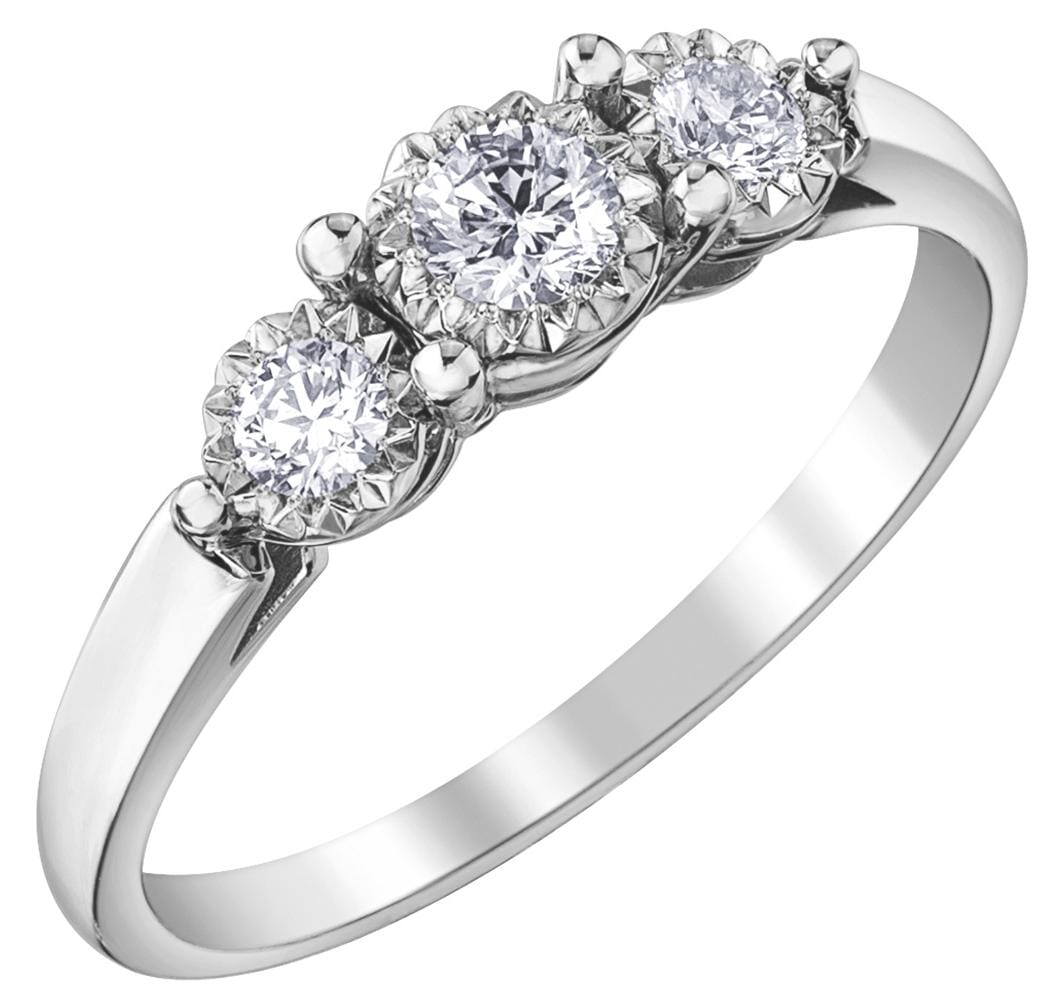 This elegant 10 Karat White Gold engagement ring features a three-stone design with round brilliant cut diamonds. The centre diamond is gracefully complemented by two smaller diamonds, creating a balanced and classic look. The sleek plain shoulders add a touch of modernity, allowing the diamonds to take centre stage. This ring beautifully symbolizes a timeless journey of love, making it a meaningful choice for your engagement.