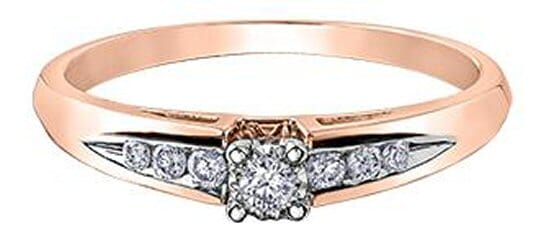 10 Karat Rose Gold, White Gold Accent Diamond Engagement Ring. 0.04 Carat Center Diamond 0.14 Carat Total Diamond Weight.