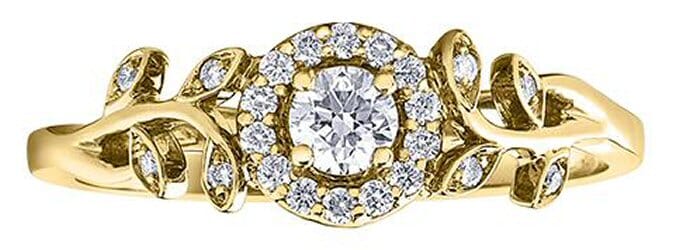 This 10 Karat Yellow Gold engagement ring features a stunning Canadian diamond at its centre, surrounded by a delicate halo and adorned with diamond accents along the shoulders. The intricate leaf-inspired design lends a natural, artistic flair, making this ring a unique choice for those seeking a touch of elegance. Perfect for adding a touch of sparkle to any special occasion, this ring can also be customized in different gold colours or karats to suit your preferences.