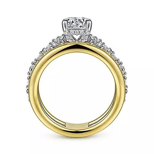 This 14 Karat Yellow Gold engagement ring with White Gold accents from Gabriel & Co. showcases a stunning Signature brilliant cut lab-grown diamond. The intricate design features diamond-adorned shoulders, creating a captivating display of light and beauty. The mixed metal look combines classic warmth with modern elegance, making this ring a unique choice for any proposal. Complete with our “One Year Satisfaction Guarantee,” this piece can be customized to suit your preferences, including changing diamond shapes, sizes, or metal options.