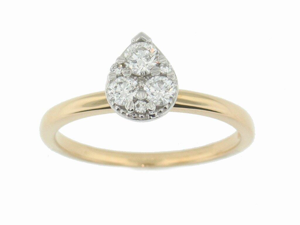 This elegant 14 Karat Yellow Gold engagement ring is accented with a white gold setting that beautifully cradles a trio of Canadian diamonds in a pear-shaped design. The smooth, plain shoulders add to its timeless appeal. Ideal for symbolizing a cherished promise, this piece offers a blend of sophistication and sparkle, making it a stunning choice for your special moments.