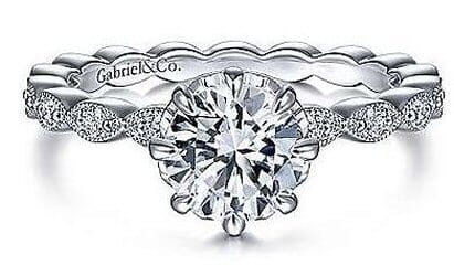 This elegant 14 Karat White Gold engagement ring from Gabriel & Co. showcases our Signature brilliant cut lab-grown diamond at its centre, complemented by intricate diamond-accented shoulders. The unique design of the band adds an extra touch of sophistication, blending seamlessly with the sparkle of earth-mined accent diamonds. A beautiful choice for those seeking a timeless yet contemporary piece, perfect for making unforgettable moments.