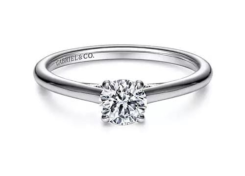 This 14 Karat White Gold Solitaire Engagement Ring from Gabriel & Co. showcases a Signature brilliant-cut lab-grown diamond set in a classic four-prong setting. The simple, sleek band highlights the round brilliant cut centre stone, making it the perfect choice for those who appreciate timeless elegance. A versatile piece that pairs beautifully with any wedding band, it is a refined option for a memorable proposal.