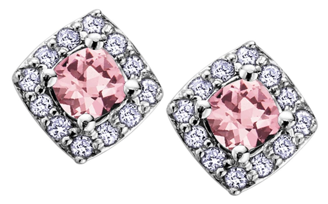 10 Karat White Gold Pink Tourmaline, Diamond Stud Earrings. 0.12 Carat Total Diamond Weight.