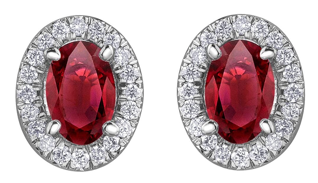 These stunning 10 Karat White Gold stud earrings feature an exquisite oval-shaped cut ruby surrounded by a halo of dazzling diamonds, creating a look of timeless elegance and sophistication. The rich red hue of the ruby beautifully contrasts with the sparkling diamonds, making these earrings a perfect accessory for any occasion. Each earring measures 7.6mm in height and 6.2mm in width, offering a classic yet bold statement. Whether for a special event or everyday wear, these earrings add a touch of glamour and luxury to any ensemble.