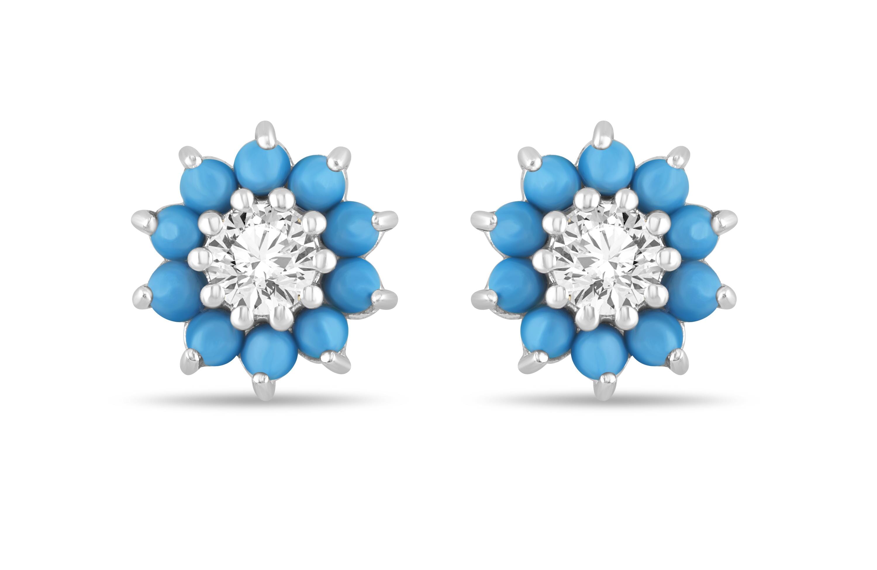 10 Karat White Gold Turquoise, Diamond Stud Earrings.0.15 Carat Total Diamond Weight.