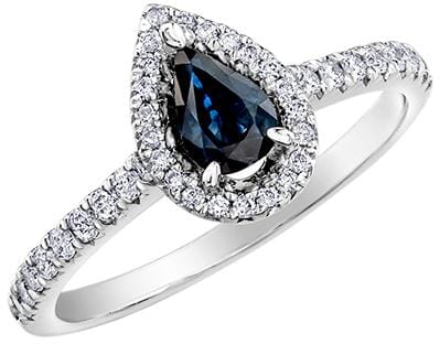 This elegant 10 Karat White Gold ring features a stunning pear-shaped Blue Sapphire encircled by a sparkling halo of round Diamonds. The Diamonds extend along the band, enhancing the ring's luxurious appeal. Perfect for adding a touch of sophistication to any outfit.