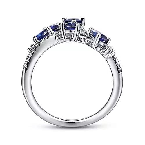 This stunning 14 Karat White Gold Ring is a true showstopper, featuring a unique design that artfully combines the elegance of blue sapphires with the brilliance of diamonds. The ring showcases multiple pear-shaped blue sapphires, each carefully set to create a cascading effect that draws the eye. The sapphires are beautifully complemented by a delicate band adorned with shimmering diamonds, adding a touch of luxurious sparkle to the overall design. The combination of rich blue sapphires and radiant white diamonds set in white gold creates a timeless and sophisticated look, making this ring a perfect statement piece for any special occasion.
