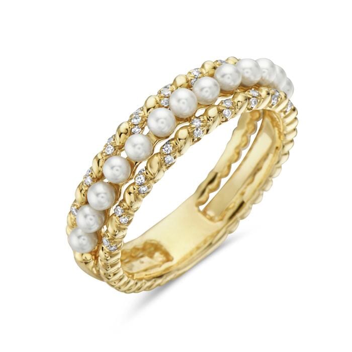 This exquisite 14 Karat Yellow Gold ring features a unique design with a row of lustrous pearls flanked by sparkling accent diamonds. The combination of pearls and diamonds creates a sophisticated and luxurious look. This piece is perfect for adding an elegant touch to your ensemble. The intricate design and timeless appeal make this ring a beautiful addition to any jewellery collection.