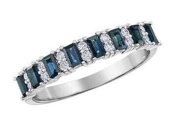 This exquisite 10 Karat White Gold ring features a captivating design with alternating deep blue sapphires and shimmering diamonds. The baguette-cut sapphires are beautifully set between rows of sparkling round diamond accents, creating a harmonious blend of colour and brilliance. Ideal for stacking or wearing alone, this ring adds a touch of sophistication and elegance to any ensemble.