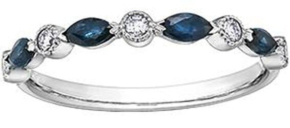 This exquisite ring features a series of marquise-shaped blue sapphires elegantly alternating with round brilliant diamonds, creating a unique pattern across the band. Set in lustrous 10 Karat White Gold, the sapphires radiate a deep blue hue, beautifully contrasting with the sparkling diamonds. The band is delicately crafted, making it perfect for stacking with other rings or wearing alone as a statement piece. Its combination of classic and contemporary design elements ensures this ring is a versatile addition to any jewelry collection.