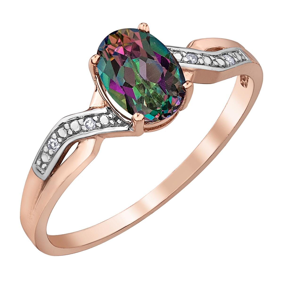 This captivating ring showcases an oval-shaped mystic topaz, set in 10 karat rose gold and accented with shimmering diamonds. The mystic topaz displays a mesmerizing array of colours, beautifully complemented by the warm tones of the rose gold and the sparkle of the diamonds. Perfect for adding a touch of intrigue and elegance to any outfit, this ring is a unique and stunning addition to your jewellery collection.
