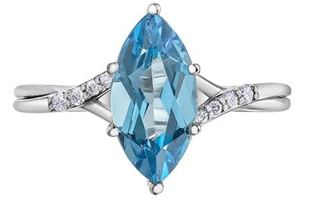 10 Karat White Gold Blue Topaz, Diamond Ring. 0.06 Carat Total Diamond Weight.