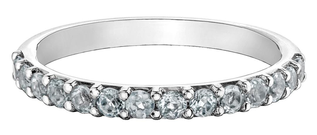 This elegant 10 Karat White Gold band features a row of stunning round brilliant cut white topaz gemstones. The simple yet sophisticated design is perfect for stacking or wearing alone, adding a touch of sparkle to your style. This piece is ideal for enhancing your everyday look with a touch of refined elegance. The versatile and timeless design ensures this band will become a treasured part of your jewellery collection.