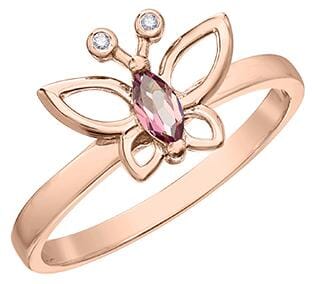 10 Karat Rose Gold Pink Tourmaline, Diamond Butterfly Ring. 0.01 Carat Total Diamond Weight.