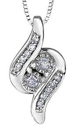 This stunning 10 karat white gold pendant necklace features multiple round brilliant cut diamonds. The pendant's flowing design enhances the sparkle of the diamonds, creating a captivating and elegant look. Measuring 15.9mm in height and 8.1mm in width, this piece is complemented by a 10K white gold chain, offering a complete and stylish accessory. The intricate curves and shimmering diamonds make this pendant an exquisite choice to add a touch of elegance to your look.
