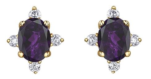 These elegant stud earrings feature oval-shaped amethysts, beautifully accented by sparkling diamonds, all set in 10 Karat Yellow Gold. The rich purple hue of the amethysts is perfectly complemented by the brilliance of the diamond accents, creating a luxurious and sophisticated design. Each earring measures 6.6mm in height and 5.4mm in width, offering a delicate yet striking look that is ideal for any occasion. These amethyst and diamond stud earrings are a timeless addition to any jewellery collection, exuding elegance and refined style.