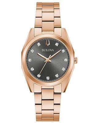 Bulova Ladies Rose Gold Tone, Stainless Steel Bracelet Diamond Dial Quartz Watch The classic Surveyor line from Bulova has been updated with a Dress Sport ladies' watch. This rose-gold watch has a stainless steel case and bracelet with an elegant flair. The sunray grey dial is hand set with 11 diamonds for both the look and feel of a luxury watch. This quality timepiece is well-made and beautifully detailed, making it an elegant addition to any collection. Calibre: 2035