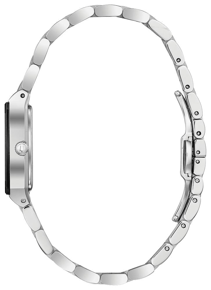 Bulova Ladies Silver Tone, Stainless Steel Bracelet Diamond Dial, 30m 3ATM Water Resistant Quartz Watch. Introducing a new tank style. Silver-tone stainless steel case with edge-to-edge black faceted metalizing mineral crystal. Black dial with three diamonds set on dial. Water resistance to 30 metres.