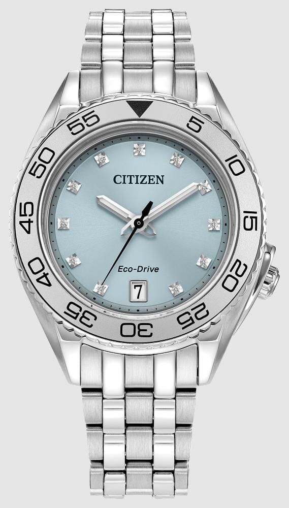 Citizen Ladies Stainless Steel Bracelet Diamond Dial, Date Only, 100m 10ATM Water Resistant Eco-Drive Watch - When sporty style meets luxury. This women’s timepiece is designed to be versatile yet elevated and features a silver-tone stainless steel case and bracelet with a light blue 3-hand dial with 11 crystal accents and a sapphire crystal, date function and a deployment clasp with push buttons for easy accessibility. Water resistant to 100 metres and sustainably powered by light with Eco-Drive and never needs a battery