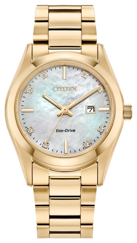 Citizen Ladies Gold Tone, Stainless Steel Bracelet Diamond Dial, Date Only, Sapphire Crystal, 100m 10ATM Water Resistant Eco-Drive Watch - When sporty style meets luxury, you get this latest stunner from Citizen. Joining ready-for-anything wearability with feminine elegance, this time-and-date timepiece is the ultimate day-to-evening watch to wear. The gold-tone stainless steel case measures 33mm in diameter and is presented on a matching, 3-link stainless steel bracelet for a sleek, versatile wear on the wrist. The radiant white mother-of-pearl dial is characterized by its highly legible style and diamond accents, elevating the sporty wearer one step further. A water resistance up to 100 metres helps the dynamic watch maintain a host of functionality without compromising its alluring appearance. Powered by Citizen’s proprietary Eco-Drive technology to provide light-powered vitality continuously and sustainably without ever needing a battery. Calibre E013.