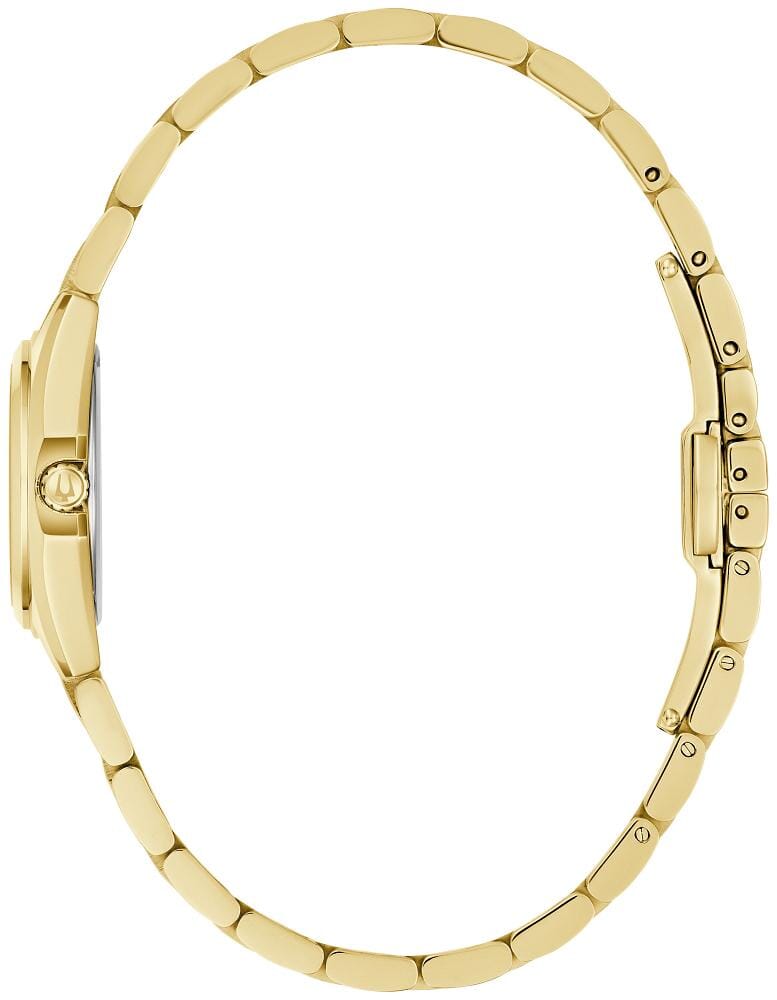 Bulova Ladies Gold Tone Sapphire Crystal, 30m 3ATM Water Resistant Quartz Watch - Defined by exceptional quality and sophisticated aesthetics, the Bulova ladies’ Surveyor is the quintessential modern timepiece updated with a mini 23mm case. Sculpted edges and faceting distinguish the gold-tone stainless steel case, with polished and brushed finishing, a flat sapphire crystal, and a matching 3-link gold-tone stainless steel bracelet with a push-button deployant clasp and easy-release latched spring bars. The radiant pink dial has a sunburst finish and gold-tone accents and hands with luminescent fill. For those with a discerning eye for refined luxury, this Bulova women’s timepiece is the perfect everyday companion.