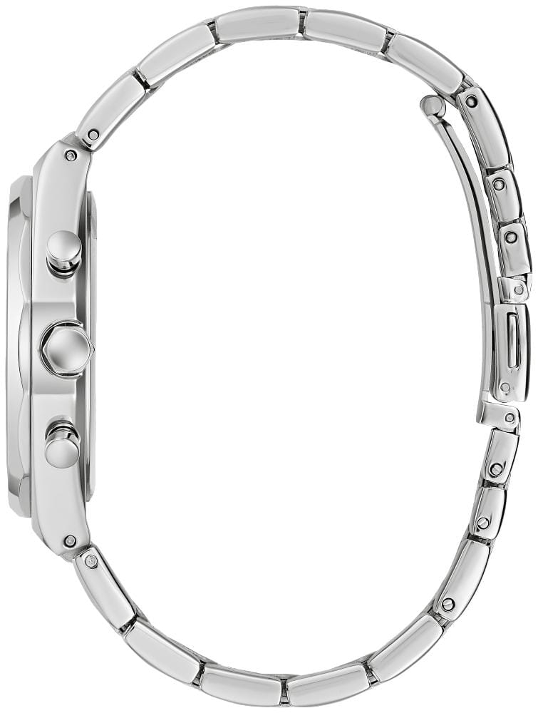 Caravelle Gents Two Tone, Stainless Steel Bracelet Date Only, 30m 3ATM Water Resistant, 24 Hour Dial Quartz Watch - This Caravelle men’s 6-hand chronograph features elevated style and uncompromising functionality. The angular silver-tone stainless steel case features a dynamic brushed finish with polished accents with a matching multi-link bracelet with a foldover clasp. The fascinating gray dial offers a balance of complementary finishes, gold-tone indices and hands with luminous fill, and a framed date display. The recessed subdials continue the gold-tone accents and feature seconds and 30-minute chronograph counters and a 24-hour display. A Caravelle men’s timepiece as practical as it is fashionable.