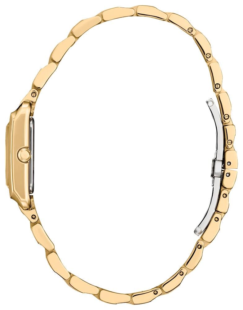 Citizen Ladies Gold Tone Eco-Drive Watch - Classic lines and subtle sophistication make this latest piece to our women’s collection, the Citizen L Bianca, a charming addition of sustainable luxury. With a design inspired and celebrating feminine motifs in art deco, the distinctive gold-tone stainless steel timepiece is a captivating accent on the wrist that's perfect for everyday wear. A curved rectangular shape defines the watch's 22mm silhouette, with a subtle crown and gold-tone stainless steel bracelet rounding out the look. On its mother-of-pearl dial, alternating applied and printed markers work with a pair of blue-touched hands for a highly aesthetic style, with its printed inner square once again pointing to chic inspirations. Sustainably powered by any light with our proprietary Eco-Drive technology that never needs a battery, this elegant ladies’ watch is the perfect addition to any outfit. Water resistant to 50 metres. Calibre B035