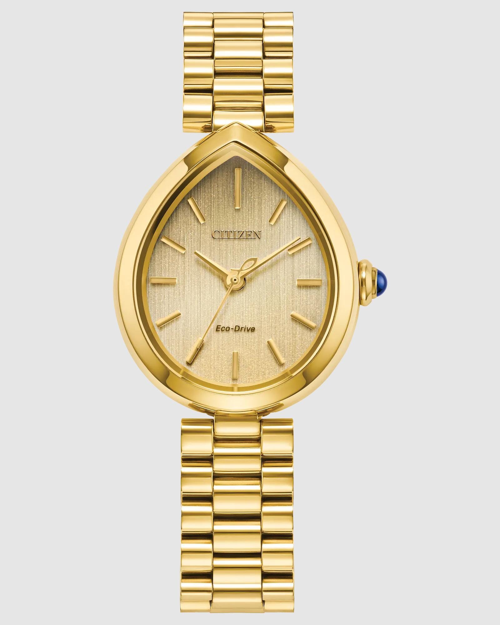 Citizen Ladies Gold Tone Sapphire Crystal, 50m 5ATM Water Resistant Eco-Drive Watch - Flirty and feminine, the new Citizen L Rainell is a watch as creative and elegant as those who wear it. With subtle dimensions of 26mm by 31mm, the signature shape of the timepiece speaks for itself in an elevated gold-tone stainless steel. An integrated bracelet and synthetic sapphire-set crown punctuate the look. A lovely gold-tone brushed dial follows the shape of the case, playing host to refined details in applied indices and matching hands. Sustainably powered by any light with our proprietary Eco-Drive technology that never needs a battery. Water resistant up to 50 meters.