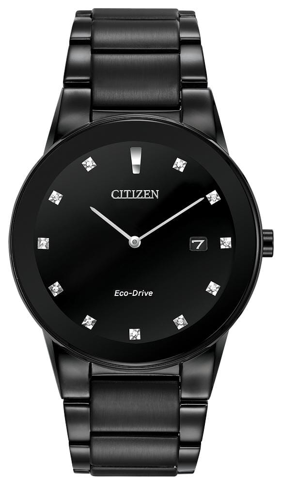 Citizen Gents Black, Stainless Steel Bracelet Diamond Dial, Date Only Eco-Drive Watch Axiom's refined yet sleek design offers a day-to-night fashion option for the avid trendsetter. This timepiece, black ion plated stainless steel case and bracelet with black dial, features the intriguing detail of edge-to-edge glass, an 11 diamond dial and date. Featuring our Eco-Drive technology – powered by light, any light. Never needs a battery.