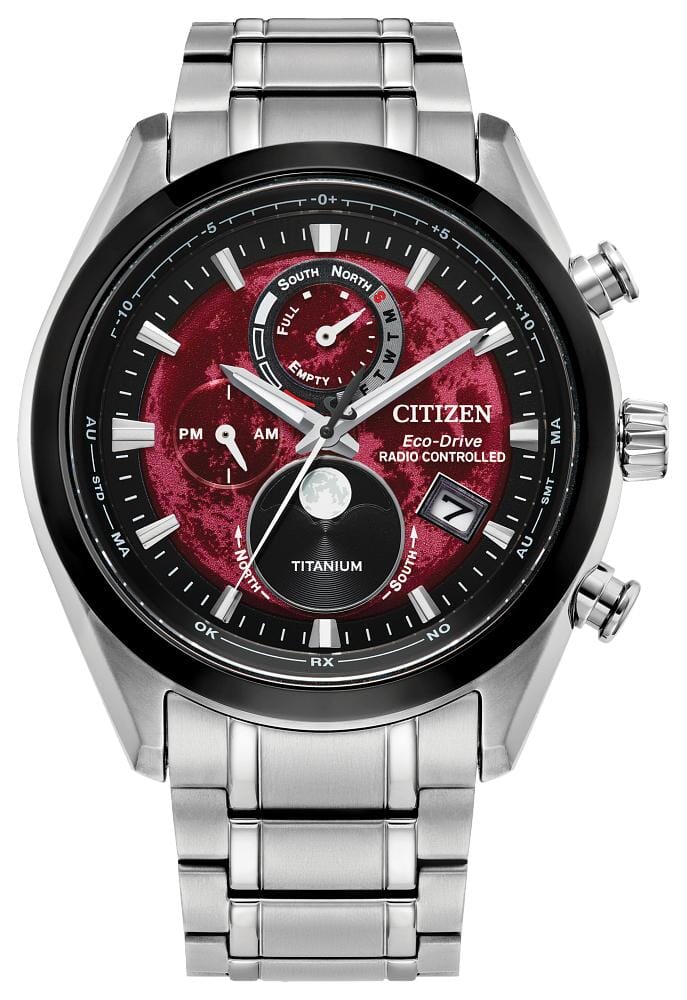 Citizen Gents Silver Tone, Titanium Day & Date, Sapphire Crystal, 100m 10ATM Water Resistant Eco-Drive Watch - When breakthrough technology and spectacular design meet, the Tsuki-yomi A-T is reading the moon. It’s the world’s first moonphase watch combined with atomic timekeeping innovation from Citizen, and this 30th Anniversary model is nothing short of impressive. The styling embodies the moon’s surface and a window at 6 o’clock displays the current moon phase. The timepiece measures 43mm in a silver-tone Super Titanium™ case, where sharp faceted edges pair with an elevated design throughout for an eye-catching aesthetic on the wrist. The deep red dial works in tandem with black accents and silver-tone touches for a display that’s as handsome as it is legible. In addition to its running time, the watch features a moon phase display, world time in 24 time zones, a perpetual calendar, and a day-date functionality. Powered by Citizen’s proprietary Eco-Drive technology to provide light-powered vitality without ever needing a battery. Water resistant up to 100 metres. Calibre H874.