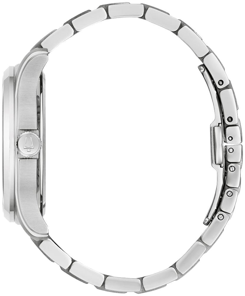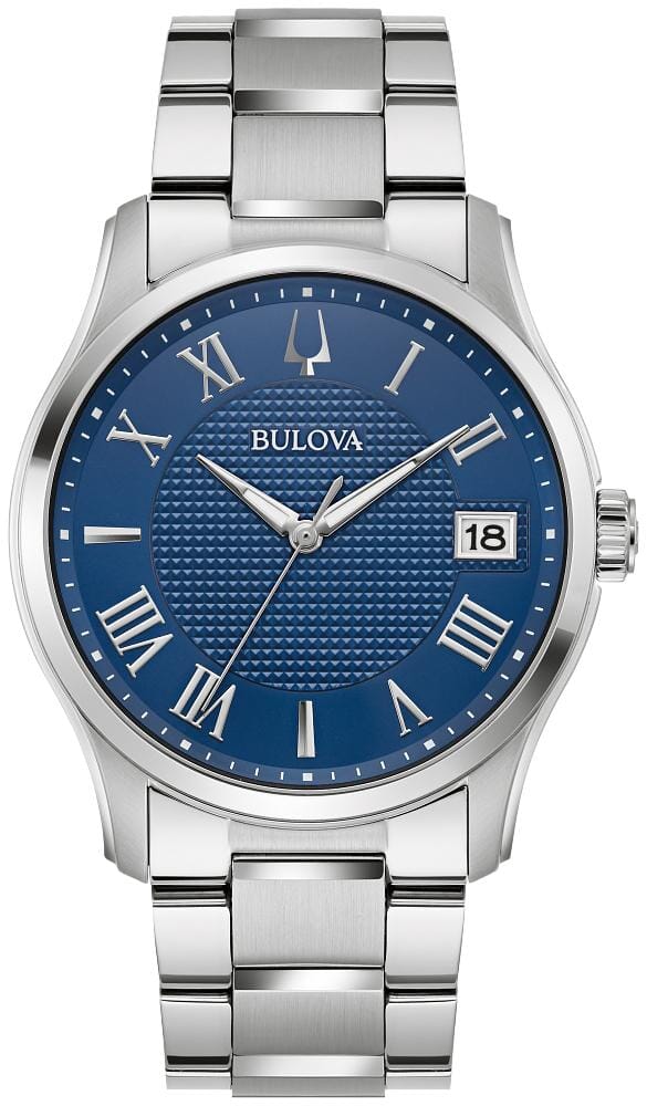 Bulova Gents Silver Tone, Stainless Steel Bracelet Date Only, 30m 3ATM Water Resistant Quartz Watch - Versatile elegance is evident in the many features and details of the Wilton 3 hand quartz timepiece from the Bulova Classic collection. This watch features a stainless steel case set with a striking blue 3-hand dial with a clous de paris intricately textured detail, calendar, polished Roman numeral markers, and a domed crystal. The silver-tone stainless steel bracelet features a deployant buckle with pushers for easy release. Get back to basics in style with the classic Wilton from Bulova.