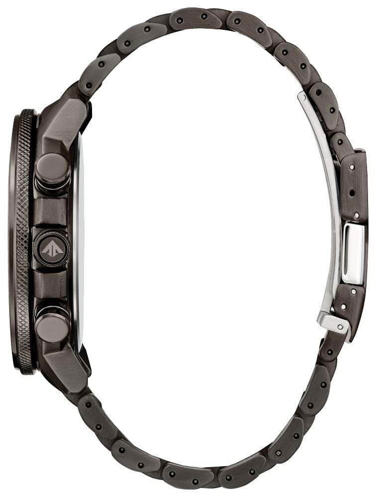 Citizen Gents Gun Metal / Gray, Stainless Steel Bracelet Day & Date, Sapphire Crystal, 200m 20ATM Water Resistant, 24 Hour Dial Eco-Drive Watch - A bold 46mm stainless steel case in a dark grey tone centres the design, with the professional-grade pilot’s watch mission-ready on the wrist, fully equipped with a bold set of chronograph pushers, 5-link steel bracelet, and an outer slide rule bezel. Towards the 6 o'clock position, a namesake northern hemisphere disc rotates counter clockwise, with the detail showcasing the world time with an old world map inspired design. Other standard and advanced functions of the watch include running hours and minutes, date indication, power reserve indication, world time, and a slide rule bezel function. This distinctive sports watch utilizes Citizen's Eco-Drive technology that’s sustainably powered by any light and never needs a battery. Water resistant up to 200 metres.