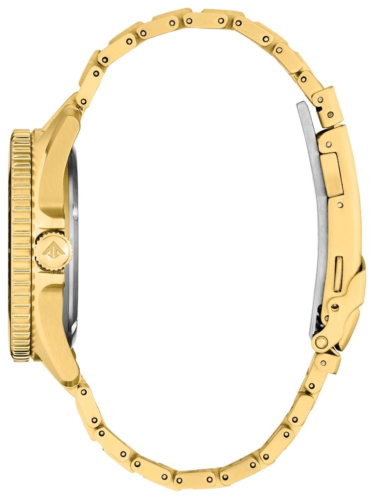 Citizen Gents Gold Tone Date Only, Sapphire Crystal, 200m 20ATM Water Resistant Eco-Drive Watch - Good looks meet dive-ready functionality in the latest Promaster Dive timepiece. Comfortable on the wrist at 41mm in gold-tone stainless steel, this handsome tool watch is secured to the wrist via a matching triple-link bracelet and stylized in wear via a green unidirectional bezel. The gradient green dial hosts the highly visible applied hour markers, with plenty of lume and a unique handset easily showcases the time no matter the lighting conditions. A subtle date window at the 3 o'clock position provides daily utility. Featuring our Eco-Drive technology – sustainably powered by light, any light. Never needs a battery. This high-performance watch includes a wetsuit extender that doubles as a tool-less microadjust, is ISO compliant and water resistant up to 200 meters, and comes in an exclusive dive tank box.