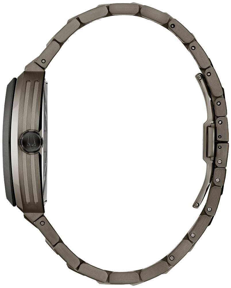 Bulova Gents Gun Metal / Gray Sapphire Crystal, 50m 5ATM Water Resistant Automatic Watch - This Bulova men’s watch from the Maquina collection offers daringly avant-garde design. The watch features a 40mm gun metal- and black-tone stainless steel case with a curved sapphire crystal and a gun metal-tone stainless steel bracelet with a push-button deployant closure. The green patterned dial with black dial ring and bridges has black hands and silver-tone markers with luminescent fill, with a central aperture revealing the inner workings of the 21-jewel automatic, also visible through a transparent case back, skeletonized movement which has a 42-hour power reserve. With its mechanical heart and unrivaled modern form, this Bulova men’s timepiece offers a uniquely individual expression of style.