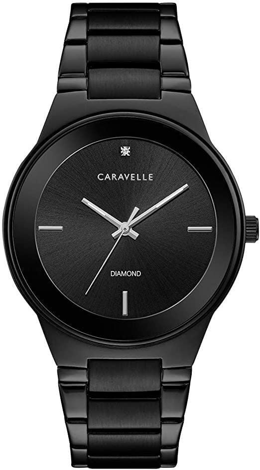 Caravelle New York Gents Black, Stainless Steel Bracelet Diamond Dial, 30m 3ATM Water Resistant Quartz Watch - Sleek and polished, with single diamond at 12 o'clock and minimalist-design hour markers on matte black dial. Black IP stainless steel case and bracelet with double-press fold-over closure.