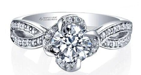 This stunning 18 Karat White Gold engagement ring features a Canadian round brilliant cut diamond at its centre, complemented by diamond-adorned shoulders. The halo design beautifully enhances the sparkle of the central diamond, creating a captivating look. This piece is perfect for making a lasting impression. The unique intertwining design adds a modern flair, making this engagement ring a timeless addition to your jewellery collection.
