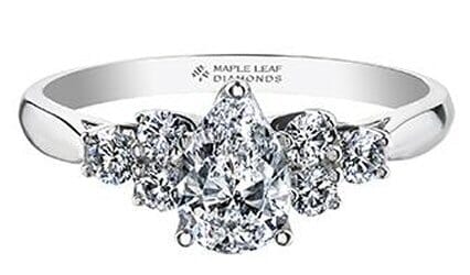 This elegant 18 Karat White Gold engagement ring showcases a stunning pear-shaped Canadian diamond at its center, flanked by additional diamonds along the shoulders. The arrangement creates a radiant and captivating look, perfect for celebrating life's most special moments.