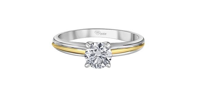 14 Karat White Gold, Yellow Gold Accent Canadian Diamond Solitaire Engagement Ring. 0.70 Carat Center Diamond 0.70 Carat Total Diamond Weight.